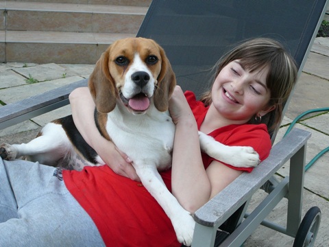 Včera na procházce jsme po půl roce potkaly bíglinku Meggie, která bydlí celkem kousek od nás, ale od prvního setkání někdy na podzim jsme už na sebe neměly štěstí. Tehdy byla Meggie ještě mrňavé štěňátko, teď už je z ní pořádná bíglice. S paničkou Lindou jsme si hned vyměnily tel. čísla, ať zase nečekáme půl roku na další náhodné setkání :-). Meggie je trikolórní bíglice z ch. s. Tergy, o dva měsíce mladší než Sandy. Linda nás pozvala na jejich velikou zahradu, kde se spolu mohly bíglí holky do sytosti vyřádit. Přetahovaly se mezi sebou i s Lindou o lano, běhaly sem a tam a neustále se mezi sebou pošťuchovaly. Vyzkoušely jsme i nějaké ty povely, pokecaly jsme s Lindinou maminkou a bylo to moc fajn.