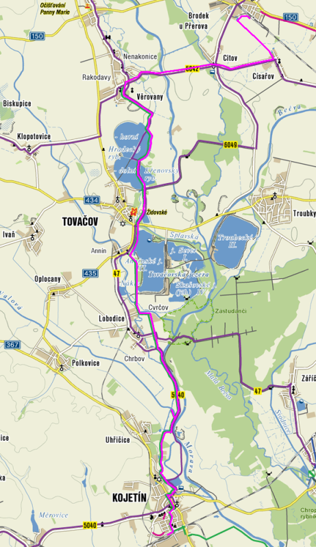Z Brodku u Přerova, kam jsme dojely vlakem, jsme vyrazily směrem na Citov a dále po zelené značce až do Kojetína. Díky mému úžasnému orientačnímu nesmyslu jsme to vzaly menší oklikou přes Císařov, ale alespoň jsem viděla pěkné hřišťátko agility na okraji obce a krásný kostel v obci. Hřiště agility nebylo vůbec oplocené, tak mě to hrozně lákalo zkusit si proběhnout nějaké skočky a tunely. Ale protože bylo hřiště na okraji pole, kde chvíli předtím Sandy zavětřila zajíce, tak jsem to neriskovala. Jinak jsme pokračovaly v pohodě a už jsem naštěstí nebloudila :). Nejhezčí úsek cesty byl asi kolem Tovačovských jezer a pak kolem Moravy před Kojetínem. Celkově vedla cesta převážně v zeleni a po rovince (jak jinak tady na Hané...), tak jsme zvládly i chvílema běžet - hlavně kvůli vlaku, který jsme naštěstí stihly. Takže jsme nakonec za odpoledne po práci ušlapaly 23 km.
